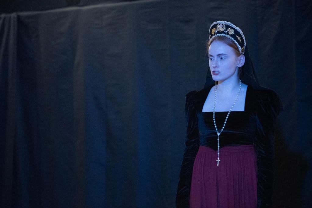 (Pictured: Charlie Hindle as Katherine of Aragon in Henry’s End. Photo credit: Claire Griffiths.)