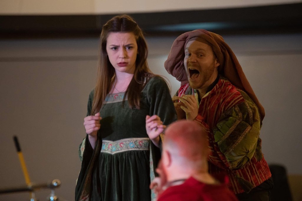 (Pictured: Emily Hobbs as Anne Boleyn, Luke Berryman as Will Somers and Dan Wilson as Henry VIII in Henry’s End. Photo credit: Claire Griffiths)